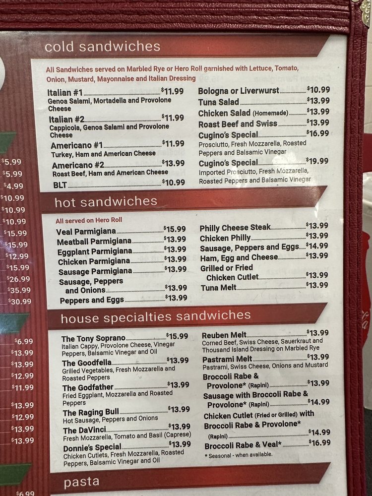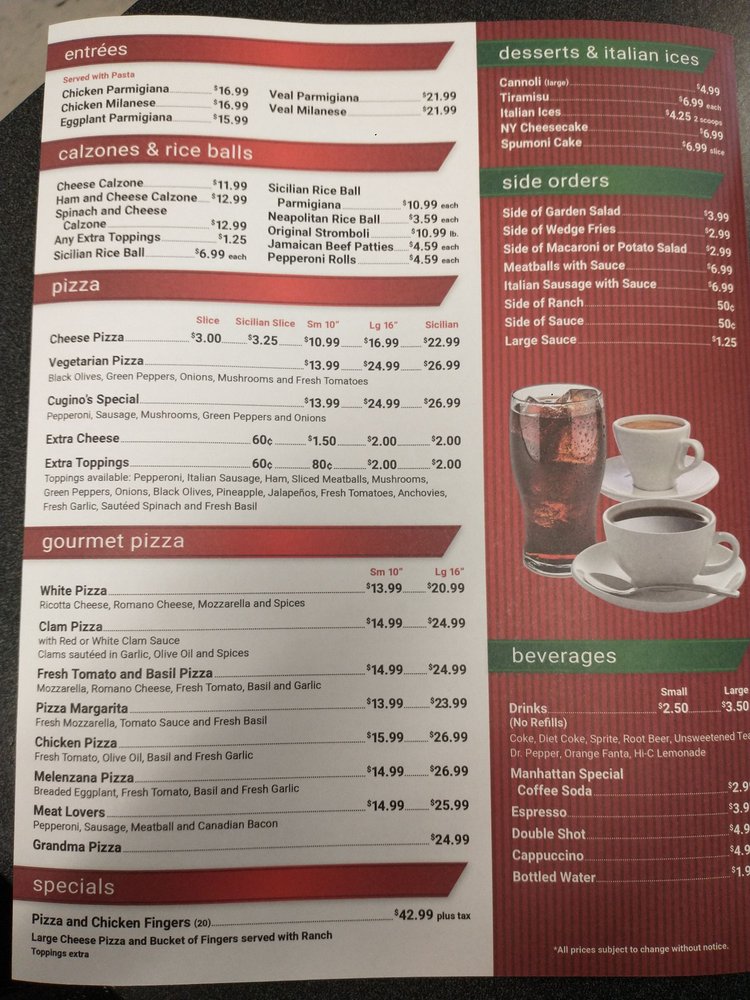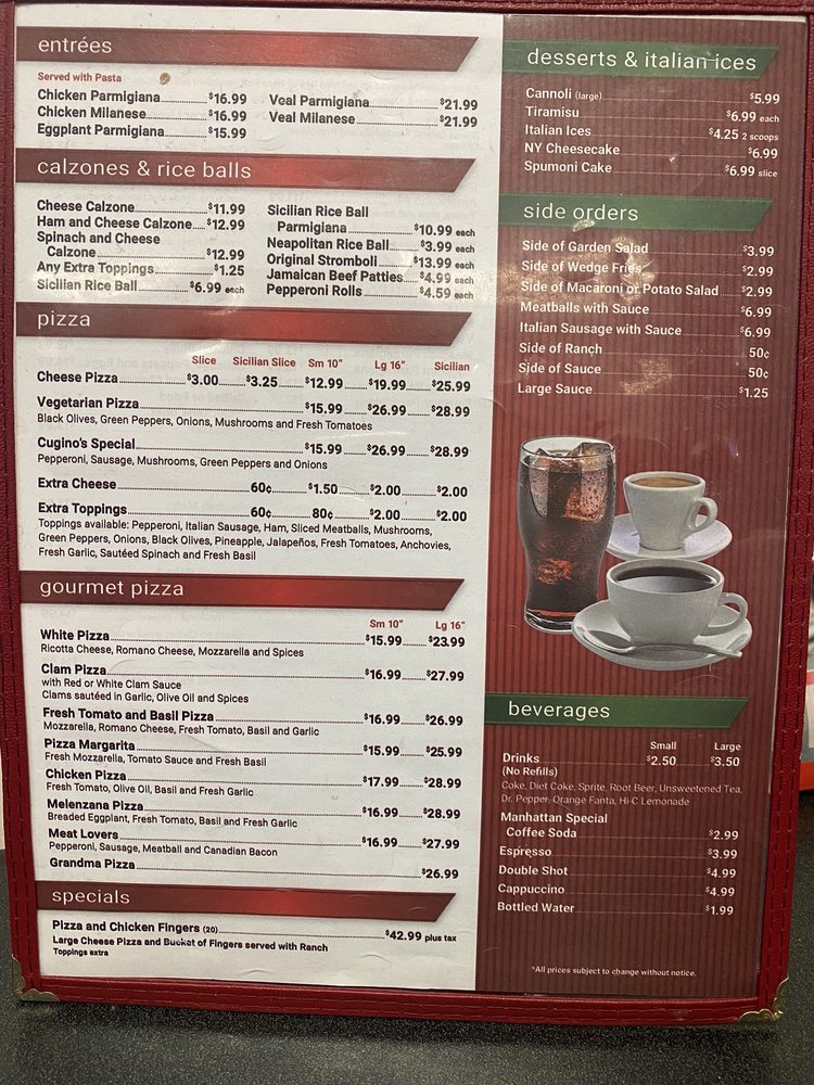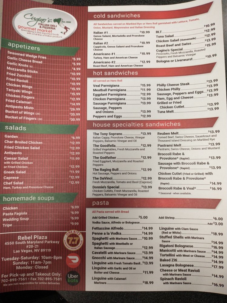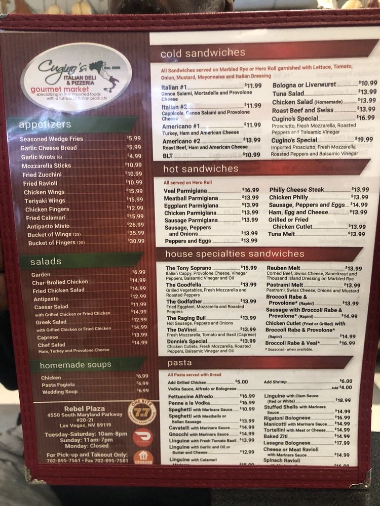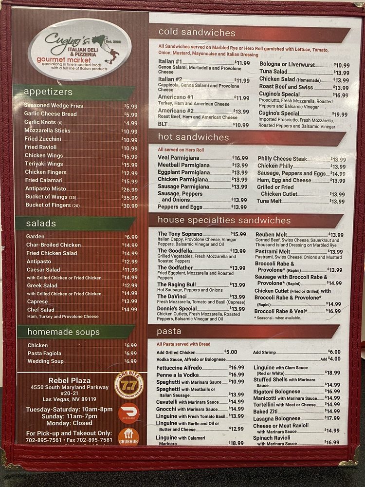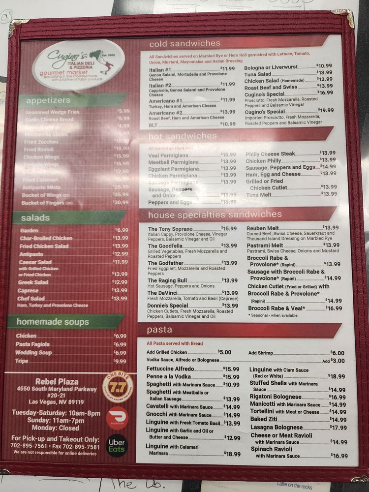 Cugino's Italian Deli & Pizzeria in Las Vegas offers a variety of Italian delights, including appetizers like Mozzarella Sticks, Fried Calamari, and Garlic Knots. Their Calzones, such as the Spinach and Cheese or Ham and Cheese, are must-tries. Customers praise the authentic taste of their pizzas, with one reviewer claiming it rivals the best in NYC. The friendly staff and cozy atmosphere create a welcoming dining experience. Additionally, the fresh homemade mozzarella and Italian sausages are highly recommended. With options for catering, delivery, and takeout, Cugino's is a convenient choice for delicious Italian cuisine. Enjoy a slice of New York right in Vegas at Cugino's Italian Deli & Pizzeria.
